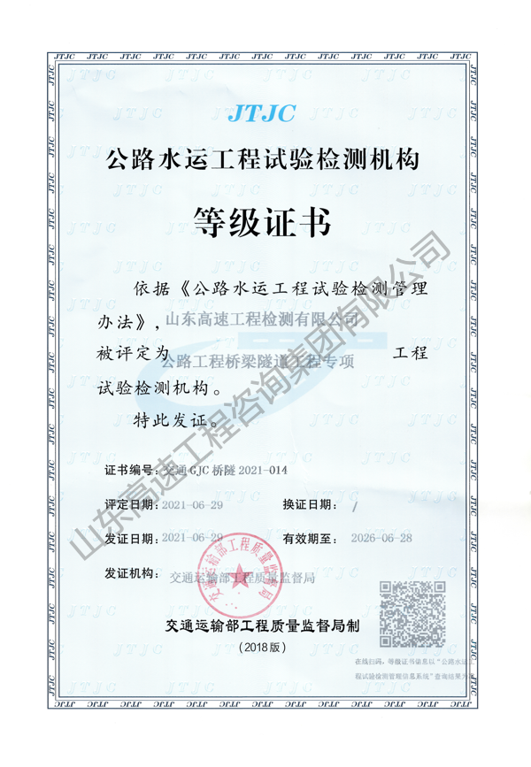 交通運(yùn)輸部工程質(zhì)量監(jiān)督局公路工程橋梁隧道工程專項(xiàng)試驗(yàn)檢測(cè)機(jī)構(gòu)證書