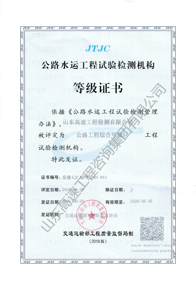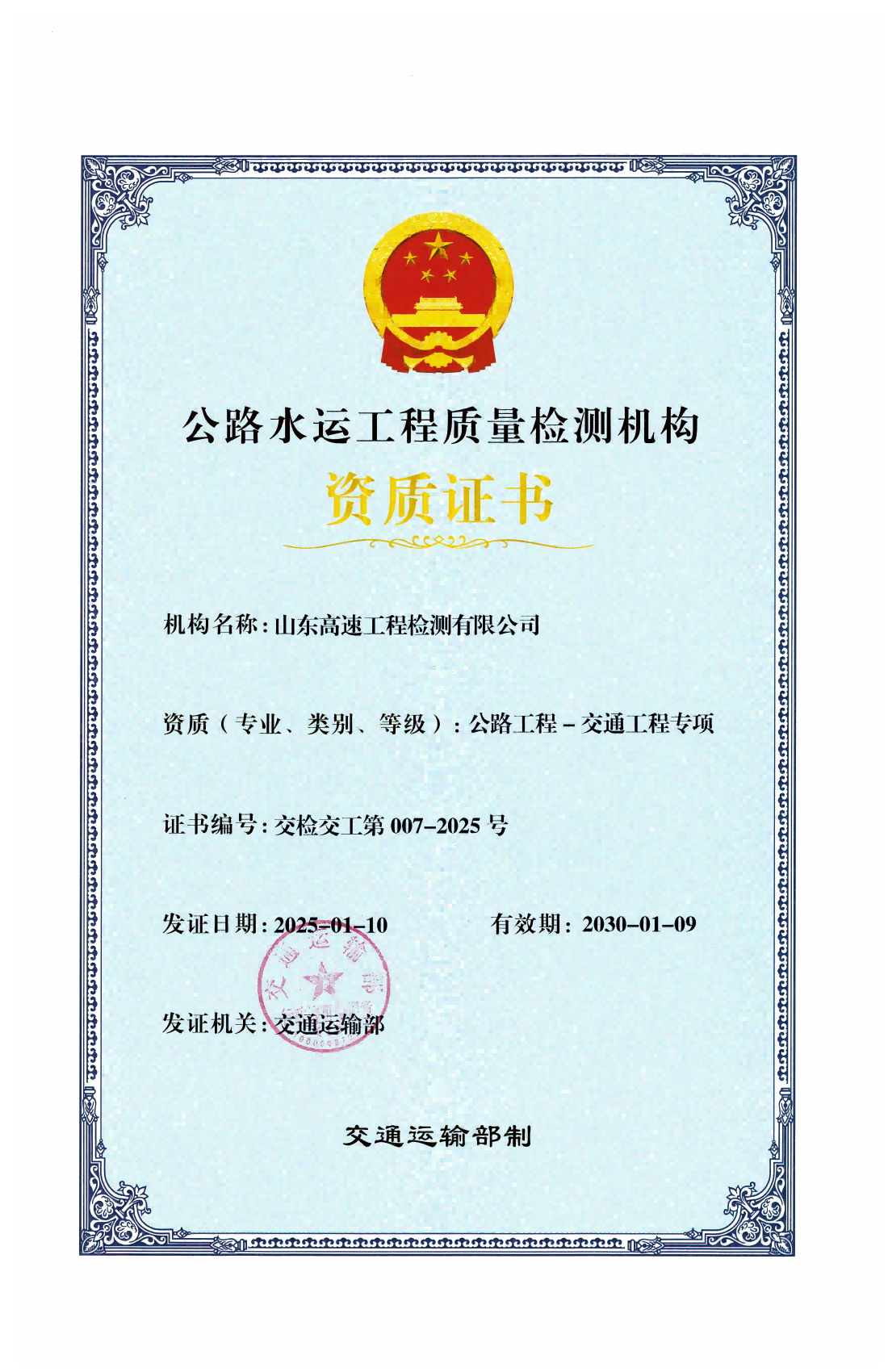 交通運(yùn)輸部工程質(zhì)量監(jiān)督局公路工程綜合甲級(jí)工程試驗(yàn)檢測(cè)機(jī)構(gòu)資質(zhì)證書