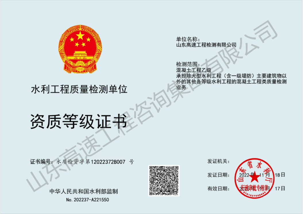 水利工程質(zhì)量檢測(cè)資質(zhì)等級(jí)證書(混凝土工程乙級(jí))