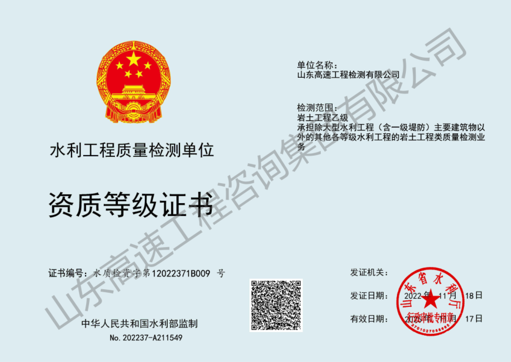 水利工程質(zhì)量檢測(cè)資質(zhì)等級(jí)證書(巖土工程乙級(jí))