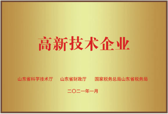 2021年1月獲得山東省科學技術廳、山東省財政廳、國家稅務總局山東省稅務局授予的“高新技術企業”榮譽稱號