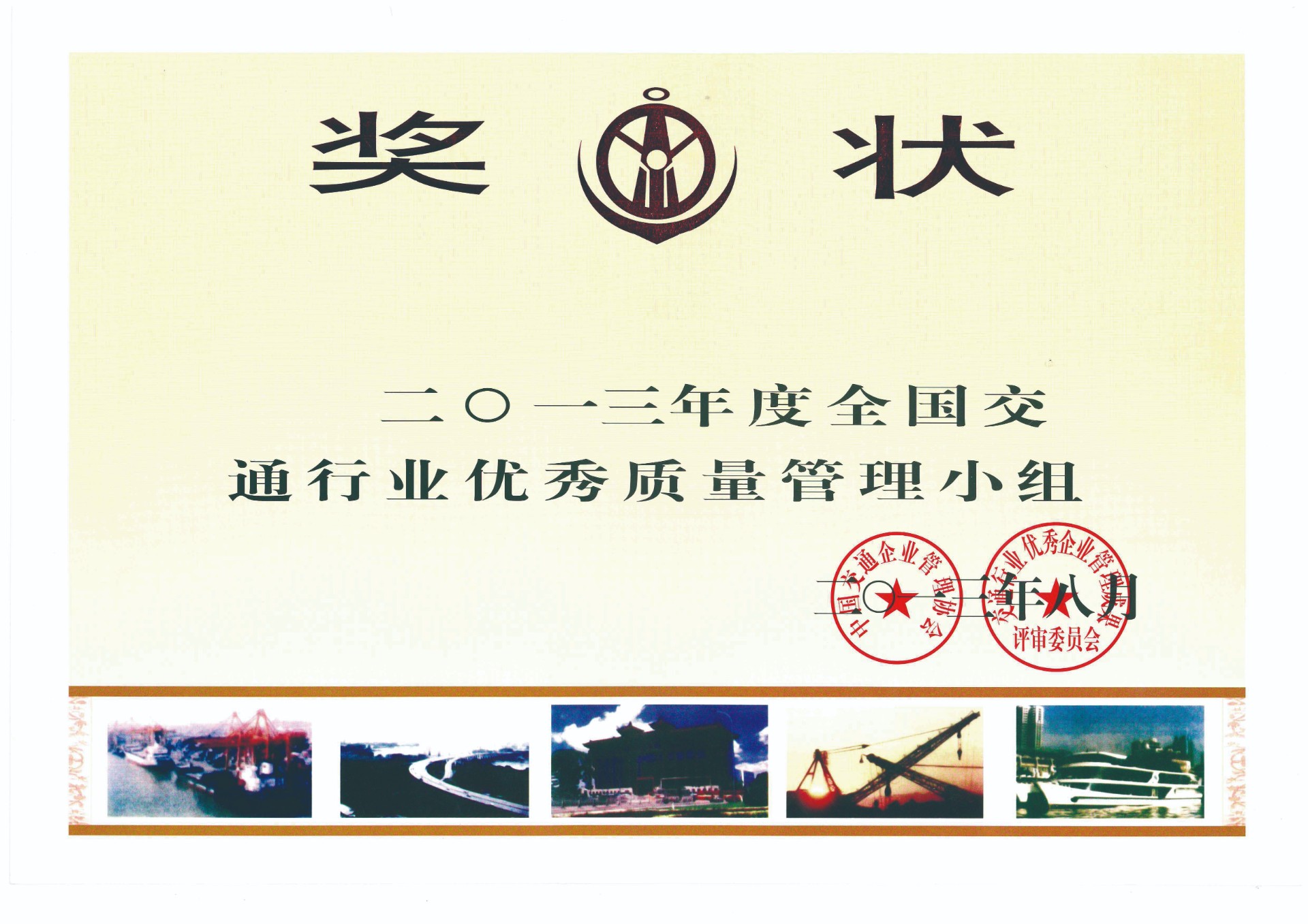 2013年8月獲得中國交通企業管理協會、交通行業優秀企業管理成果評審委員會授予的“2013年度全國交通行業優秀質量管理小組”榮譽稱號