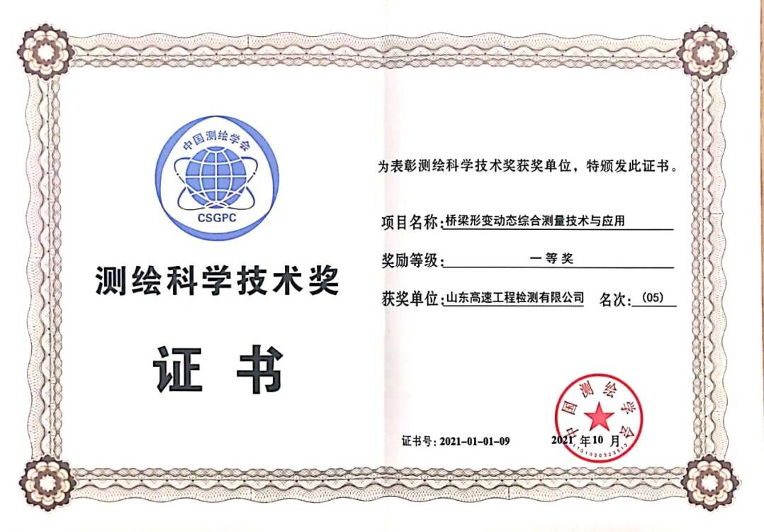 橋梁形變動態綜合測量技術與應用成果于2021年10月獲得中國測繪學會授予的“2021年度測繪科學技術一等獎”榮譽稱號