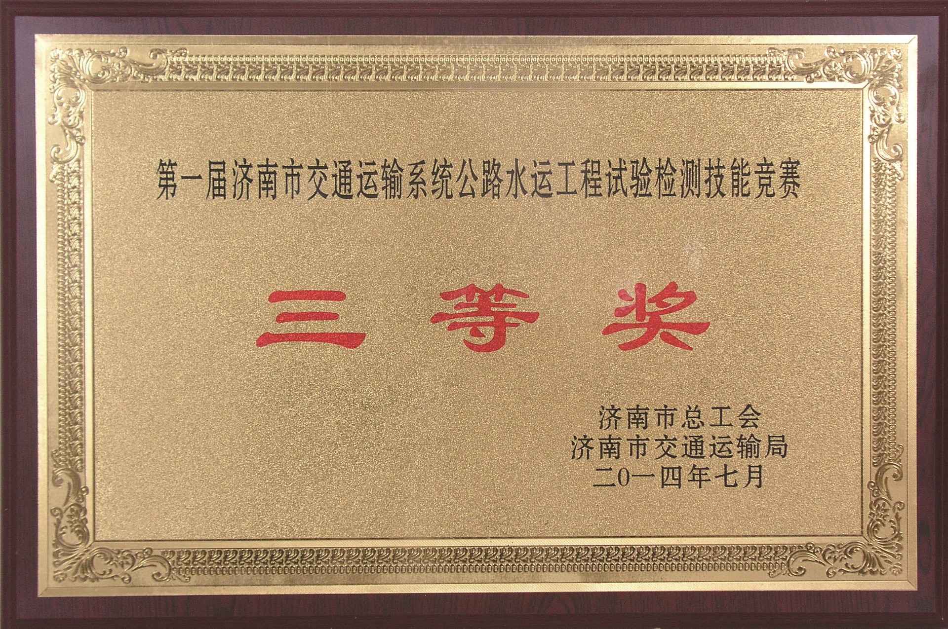 2014年7月在濟南市總工會、濟南市交通運輸局舉辦的第一屆濟南市交通運輸系統公路水運工程試驗檢測技能競賽中獲得“三等獎”