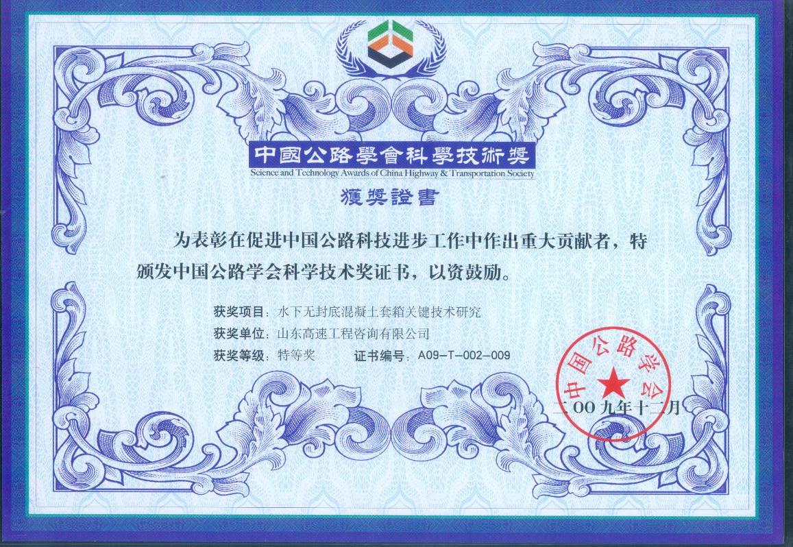 水下無封底混凝土套箱關鍵技術研究項目于2009年12月獲得中國公路學會授予的“中國公路學會科學技術獎”榮譽稱號
