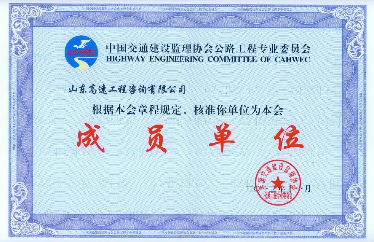 2012年11月獲得中國交通建設監理協會公路工程專業委員會授予的“中國交通建設監理協會成員單位”榮譽稱號