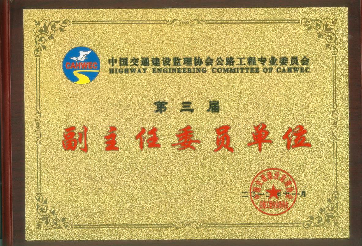 2012年11月中國交通建設監理協會公路工程專業委員會授予的“中國交通建設監理協會副主任委員單位”榮譽稱號