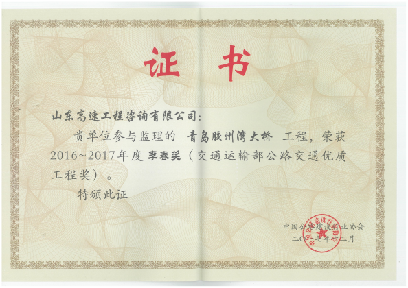 承監的青島膠州灣大橋工程于2017年12月獲得中國公路建設行業學會授予的“李春獎”榮譽稱號