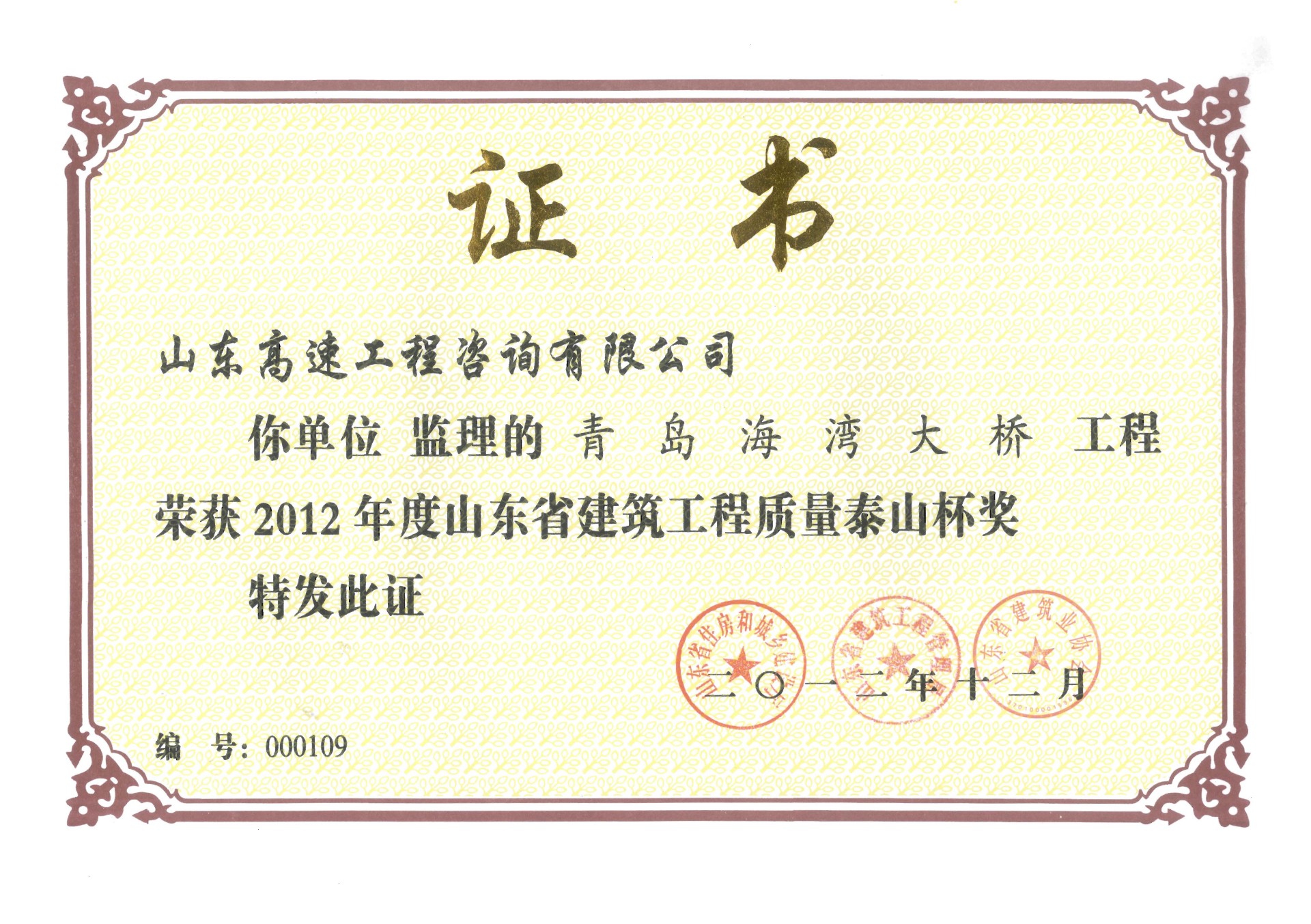 承監的青島海灣大橋工程于2012年12月獲得山東省住房和城鄉建設廳、山東省建筑工程管理局、山東省建筑業協會聯合授予的“山東省建筑工程質量泰山杯”榮譽稱號