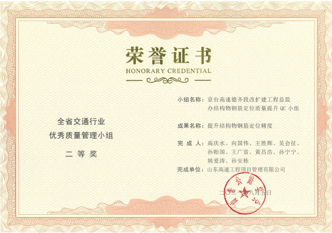 京臺德齊段總監辦結構物鋼筋定位質量提升QC小組于2021年8月獲得山東公路學會授予的“全省交通行業優秀質量管理小組二等獎”榮譽稱號