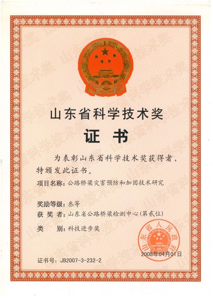 2008年4月1日公路橋梁災害預防和加固技術研究課題獲得山東省人民政府授予的“山東省科技進步三等獎”榮譽稱號