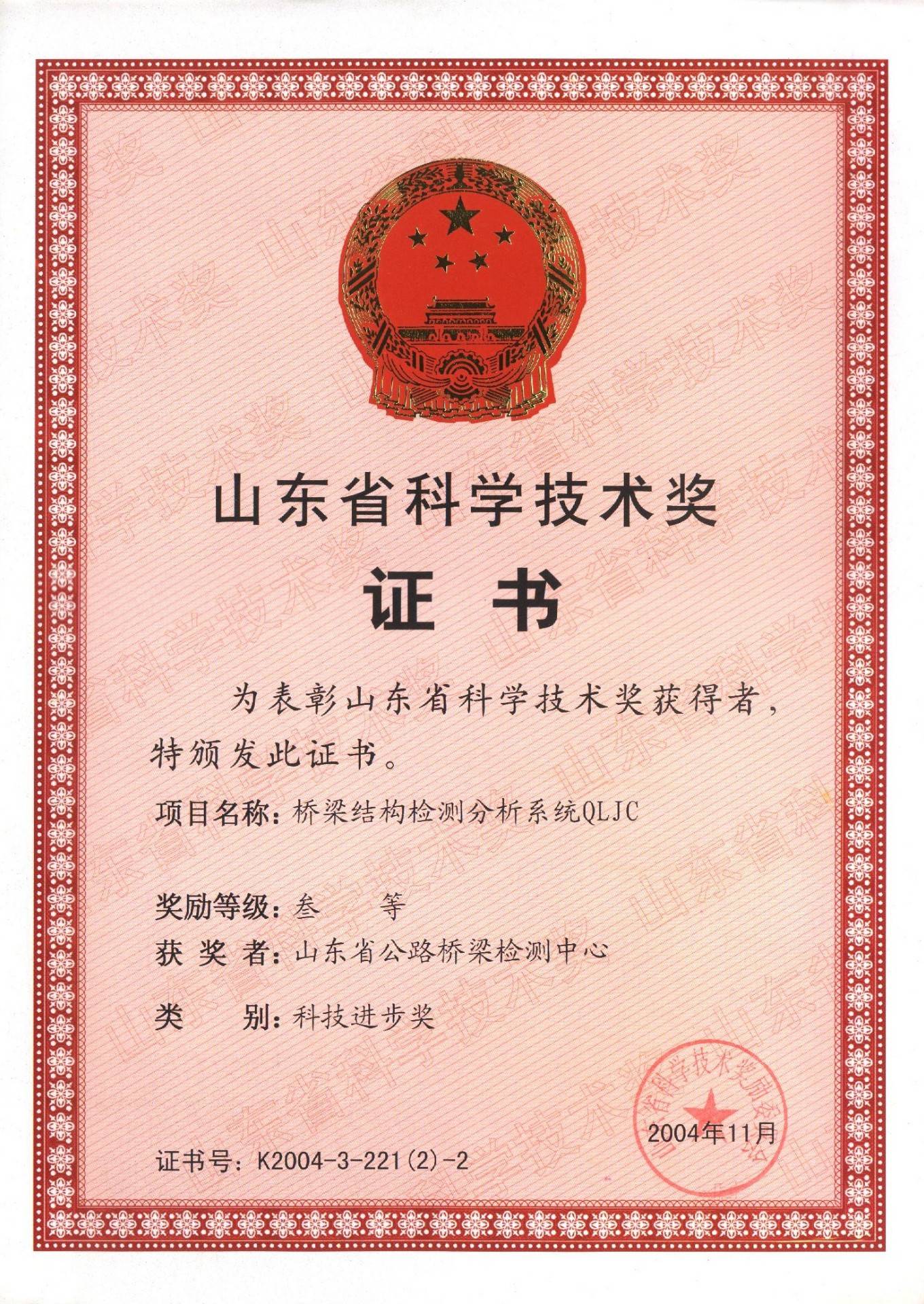 2004年11月橋梁結構檢測分析系統QLJC課題獲得山東省科學技術獎勵委員會授予的“山東省科技進步三等獎”榮譽稱號