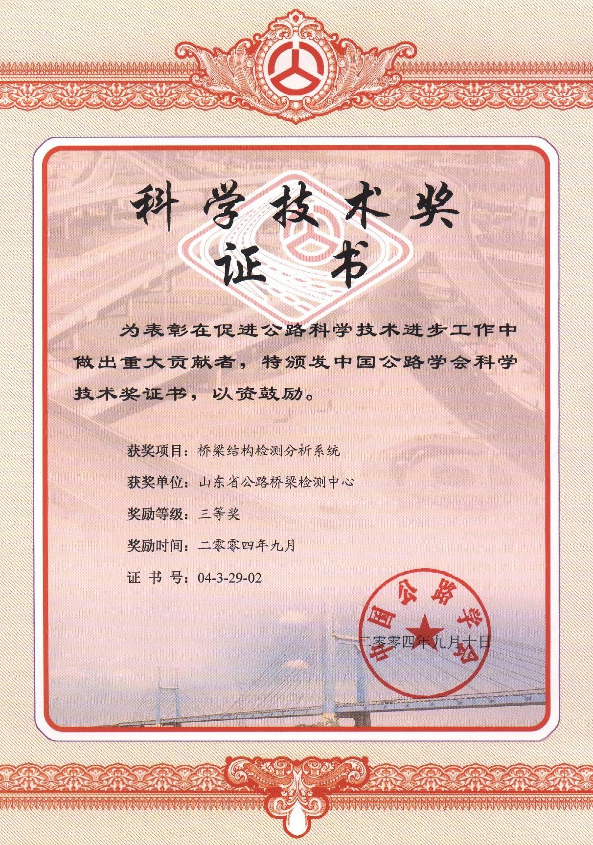 2004年9月10日橋梁結構檢測分析系統課題獲中國公路學會授予的“科學技術三等獎”榮譽稱號