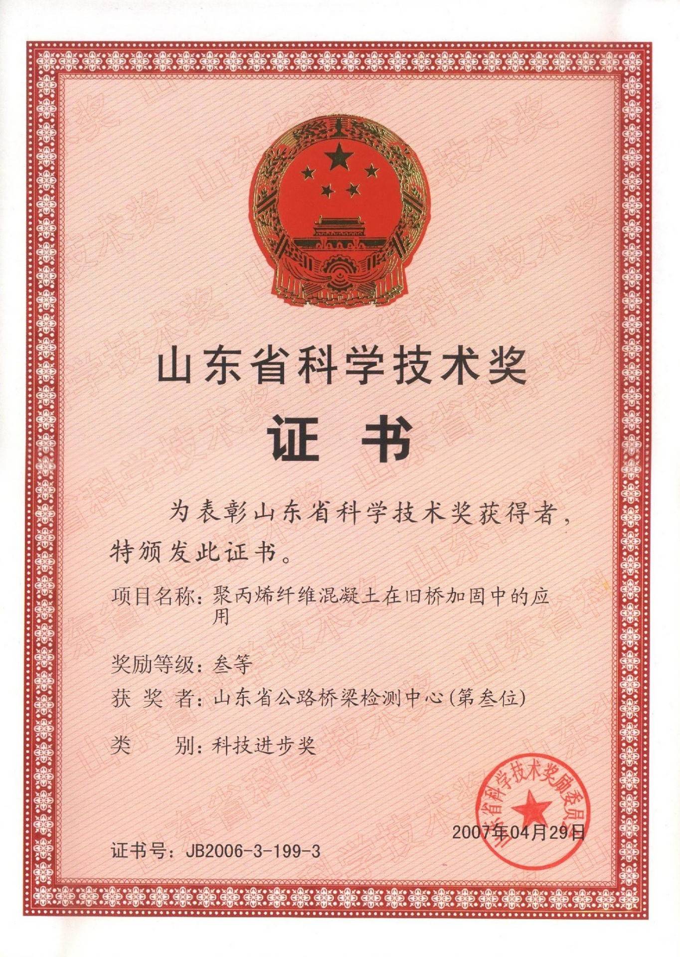 2007年4月29日聚丙烯纖維混凝土在舊橋加固中的應用課題獲得山東省科學技術獎勵委員會授予的“山東省科技進步三等獎”榮譽稱號