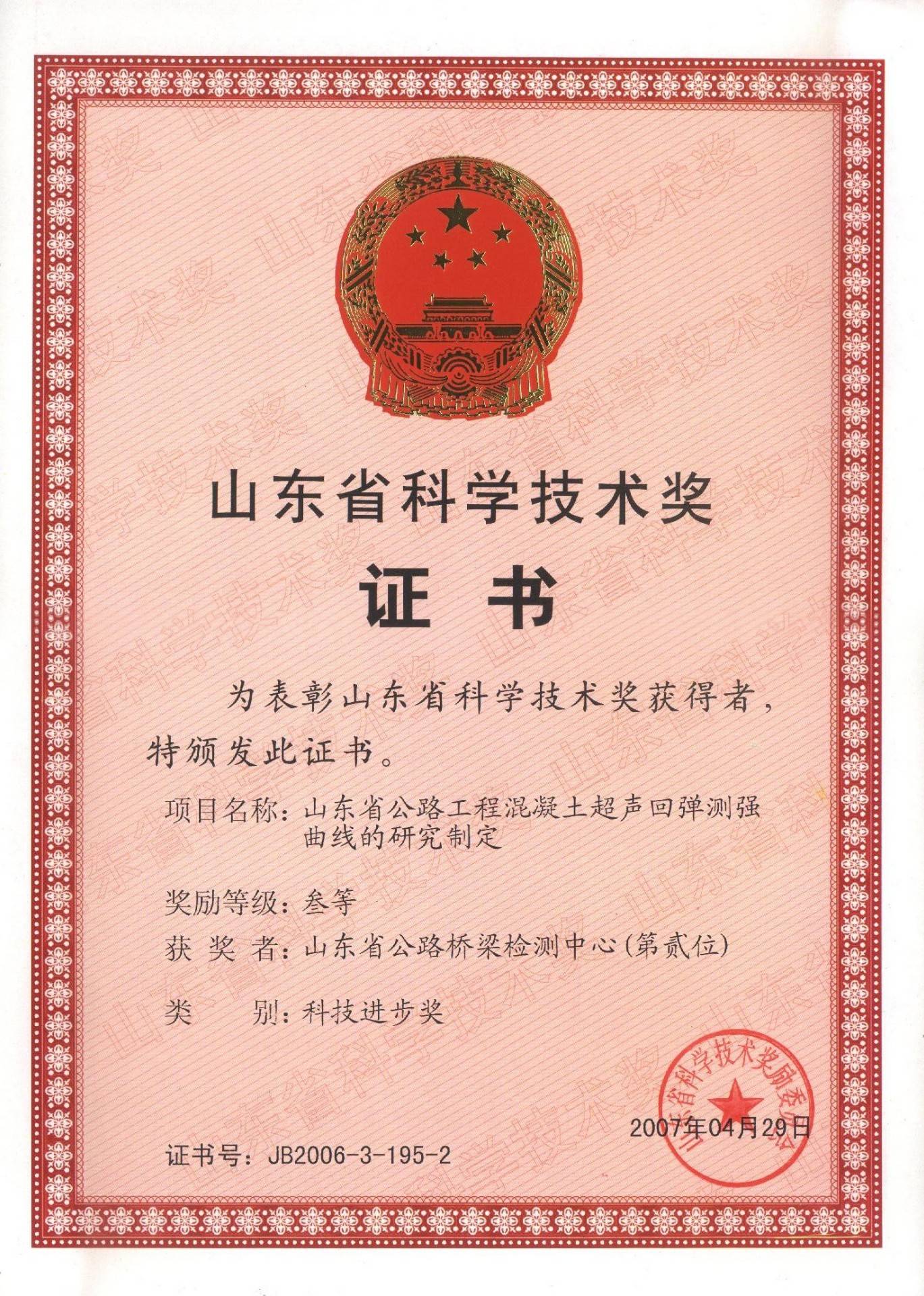 2004年4月29日山東省公路工程混凝土超聲回彈測強曲線的研究制定課題獲得山東省科學技術獎勵委員會授予的“山東省科技進步三等獎”榮譽稱號