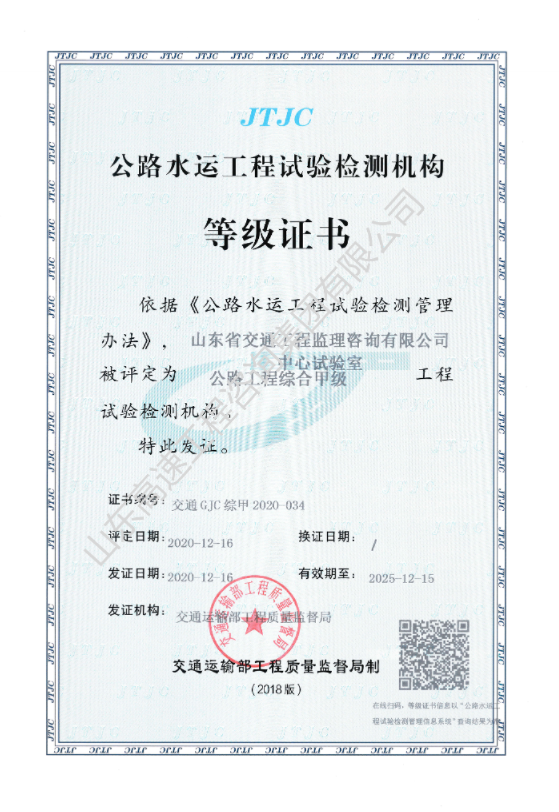 交通運輸部工程質(zhì)量監(jiān)督局公路工程綜合甲級工程試驗檢測機構(gòu)證書