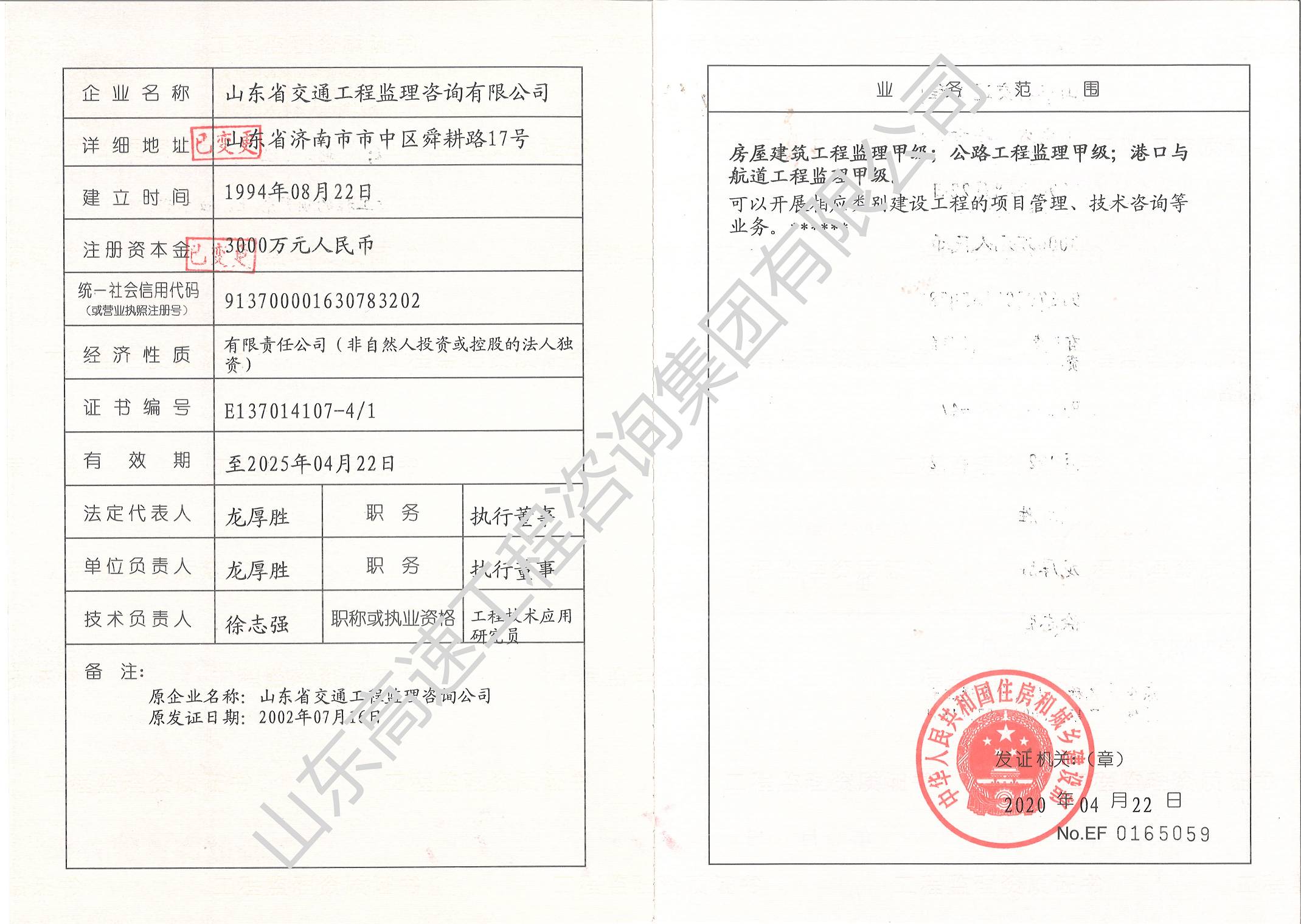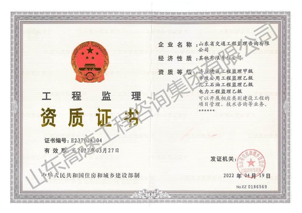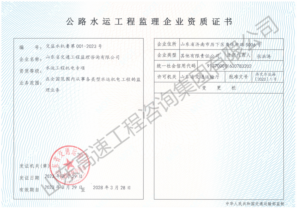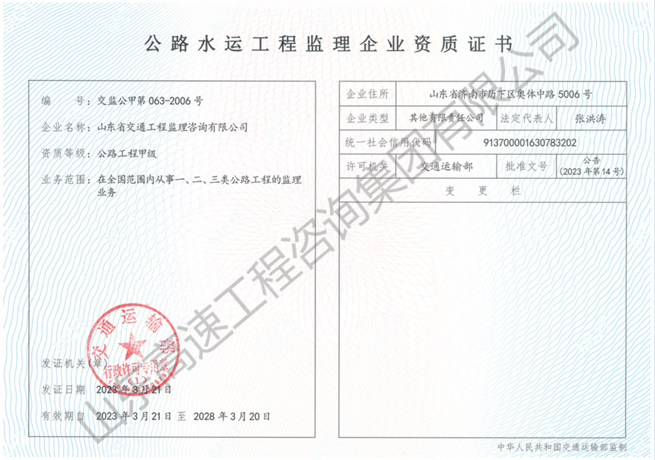 山東省交通運輸廳水運工程監(jiān)理甲級資質(zhì)