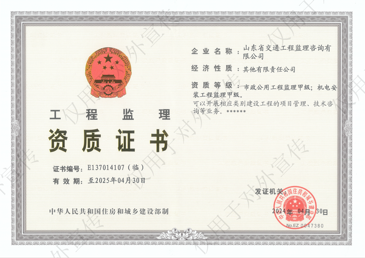 工程咨詢集團權屬山東交通監理公司取得市政公用工程、機電安裝工程監理甲級資質