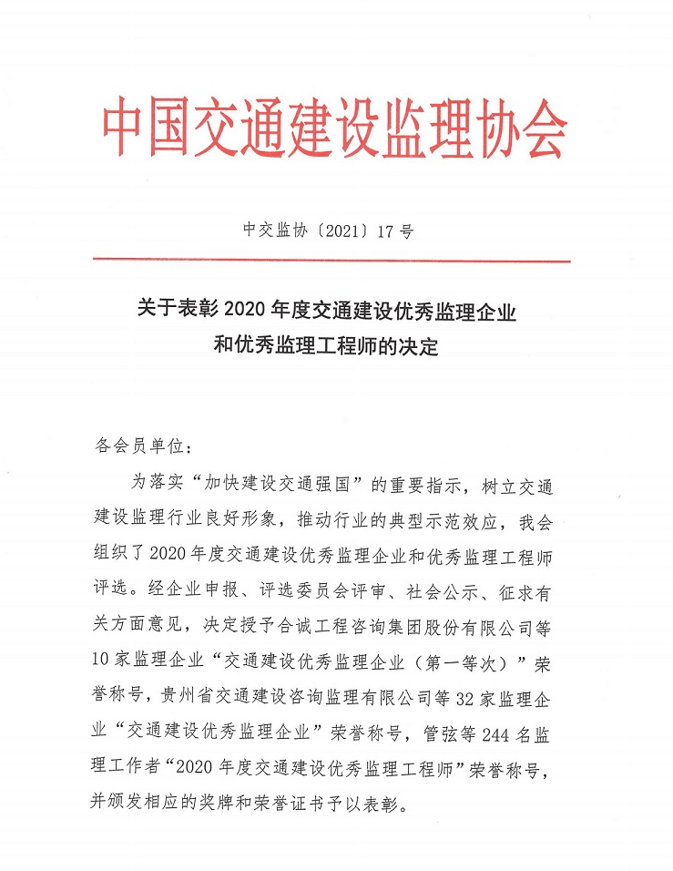 喜訊!集團兩家權屬單位雙雙榮獲 交通建設優秀監理企業