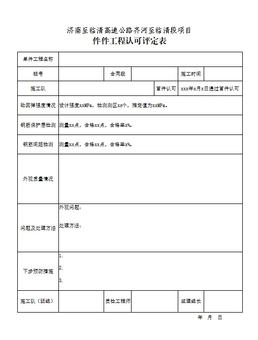 “三驗(yàn)收”,強(qiáng)化結(jié)果導(dǎo)向,積極推行“件件認(rèn)可”。一是加強(qiáng)關(guān)鍵環(huán)節(jié)驗(yàn)收,總監(jiān)辦統(tǒng)一驗(yàn)收指標(biāo)和關(guān)鍵環(huán)節(jié)驗(yàn)收記錄表,梁板出廠前由駐地辦逐梁逐指標(biāo)進(jìn)行驗(yàn)收,并加蓋“驗(yàn)收通過”印章。二是加強(qiáng)重點(diǎn)工序驗(yàn)收,制定《重點(diǎn)工序聯(lián)合驗(yàn)收記錄表》,明確重點(diǎn)工序驗(yàn)收程序和標(biāo)準(zhǔn),總監(jiān)辦在施工單位、駐地辦檢查合格的基礎(chǔ)上再進(jìn)行復(fù)核驗(yàn)收。三是加強(qiáng)重要部位驗(yàn)收,針對重要部位建立逐級質(zhì)量責(zé)任登記臺賬,形成質(zhì)量責(zé)任界定和追溯體系,針對支座安裝、臺背回填、伸縮縫等工程,由施工單位全面自檢,駐地辦逐個驗(yàn)收簽認(rèn)并填寫《件件工程認(rèn)可評定表》,總監(jiān)辦隨機(jī)抽查,確保一次驗(yàn)收合格,避免返工處理。