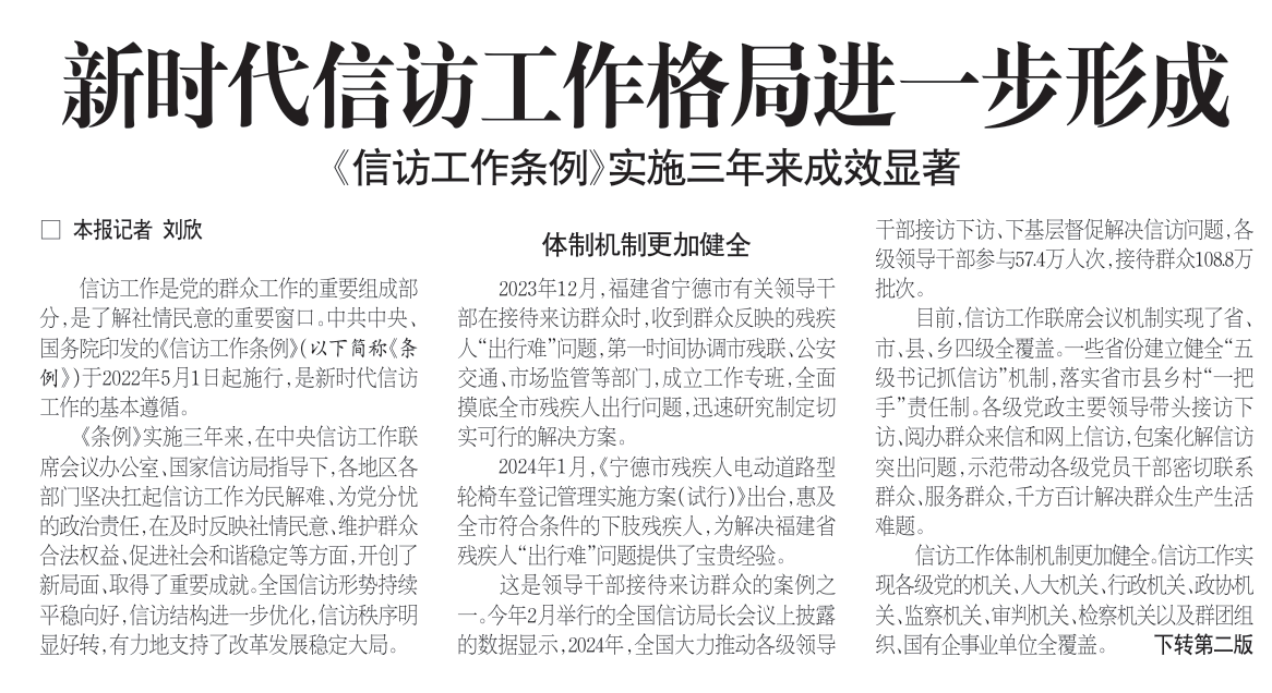 法治日報:新時代信訪工作格局進一步形成 《信訪工作條例》實施三年來成效顯著