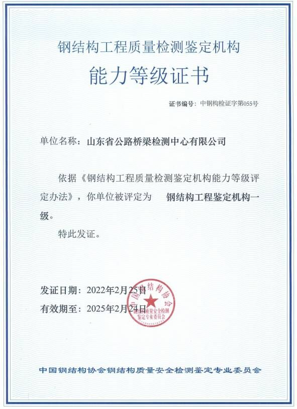 檢測中心取得鋼結構工程鑒定機構一級能力等級證書
