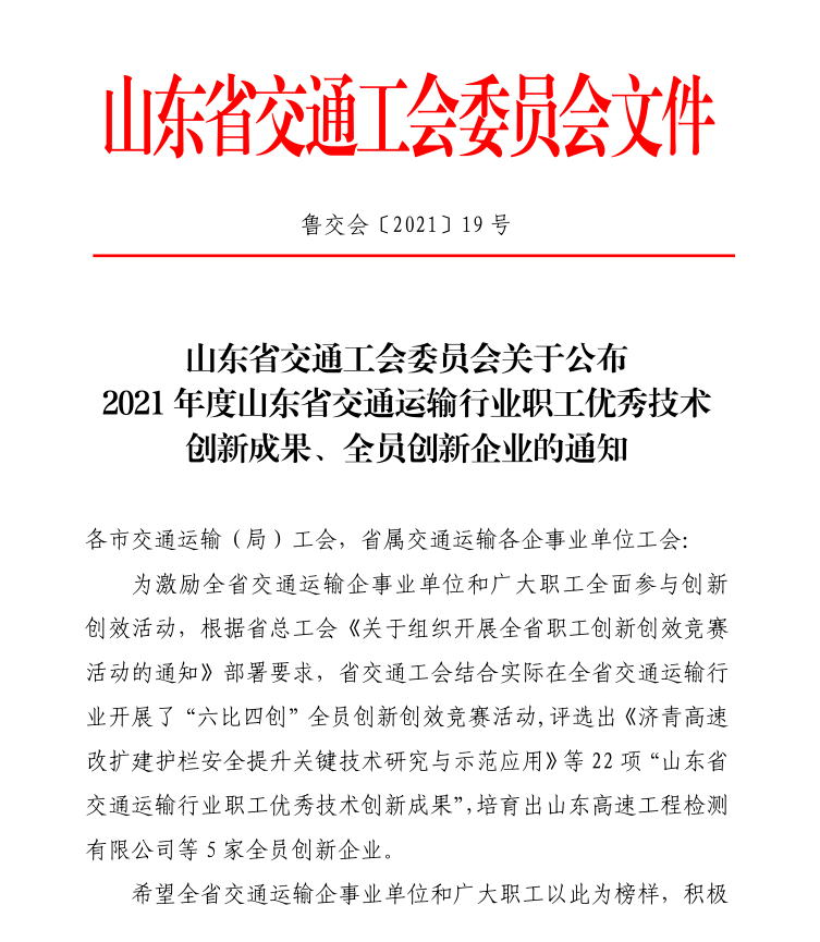 檢測公司獲2021年度山東省交通運輸行業 全員創新企業殊榮