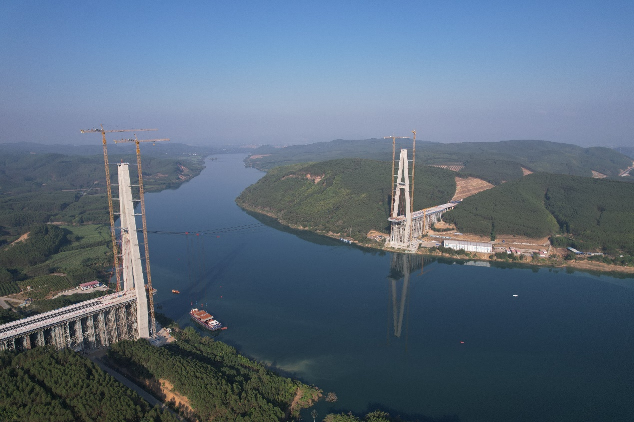 山高項管公司承監的武忻高速武宣黔江特大橋鋼箱梁首節標準段吊裝順利完成
