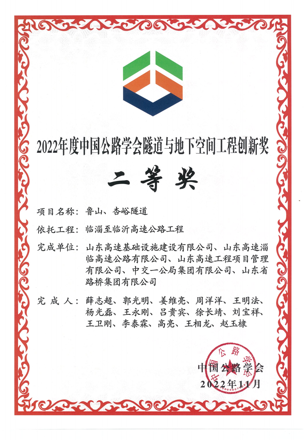 2022年度中國公路學會隧道與地下空間工程創新獎二等獎